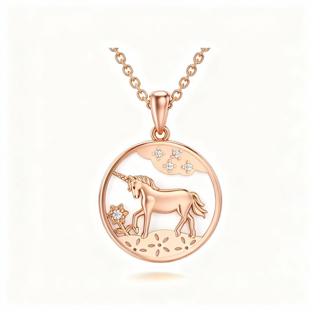 Vivi il fascino della nostra collana con pendente in Oro Rosa 10K, splendidamente progettata con un gemma Moissanite che cattura la fantasia dei girasoli e degli unicorni.