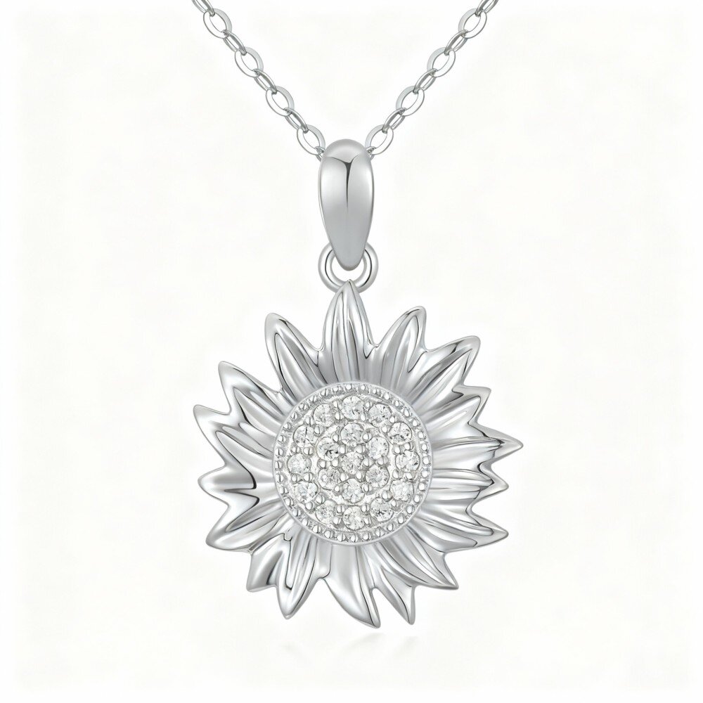 Scopri il fascino squisito della nostra collana con pendente a girasole in Oro Bianco 10K, progettata per donne che amano la bellezza senza tempo e la sofisticatezza.