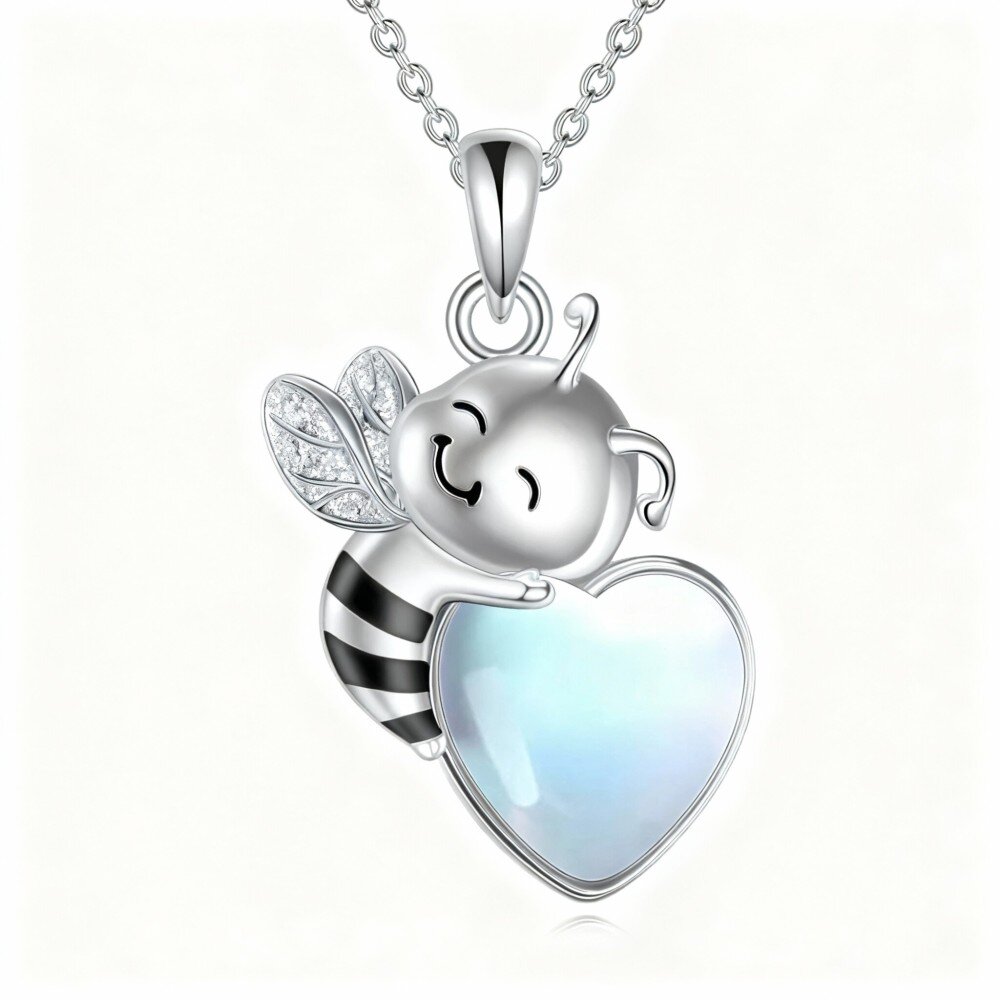 Scopri la magica bellezza della nostra collana pendente in Oro Bianco 10K con un affascinante centro in pietra di luna e un delizioso design di ape e cuore.