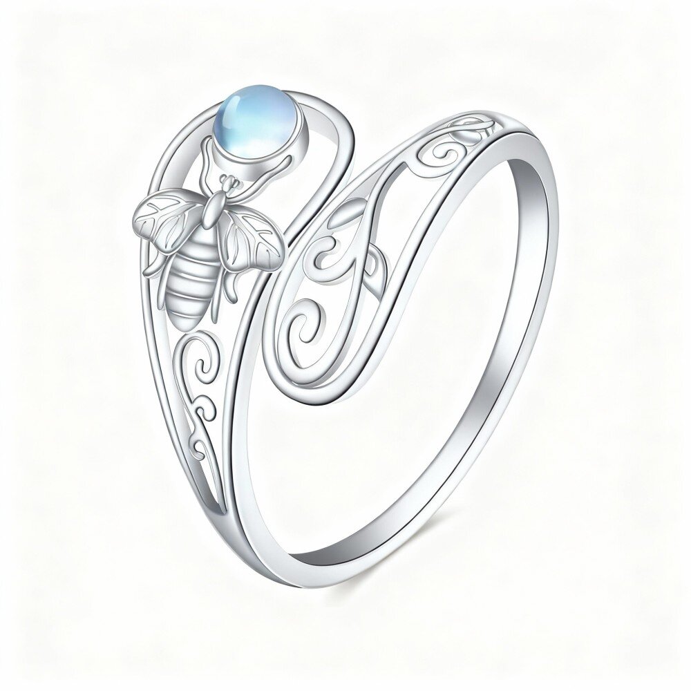 Scopri il fascino del nostro Anello Aperto in Oro Bianco 10K, un perfetto connubio di eleganza celestiale e fascino naturale con una bellissima pietra luna e un design di ape per donne moderne.
