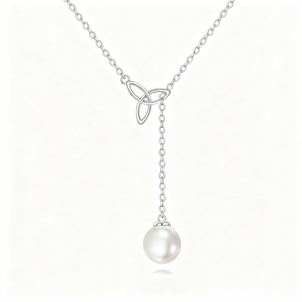 Aumenta la tua eleganza con la nostra bellissima collana Y regolabile con accentuazione di perla e un design di nodo celtico, creata per donne raffinate.