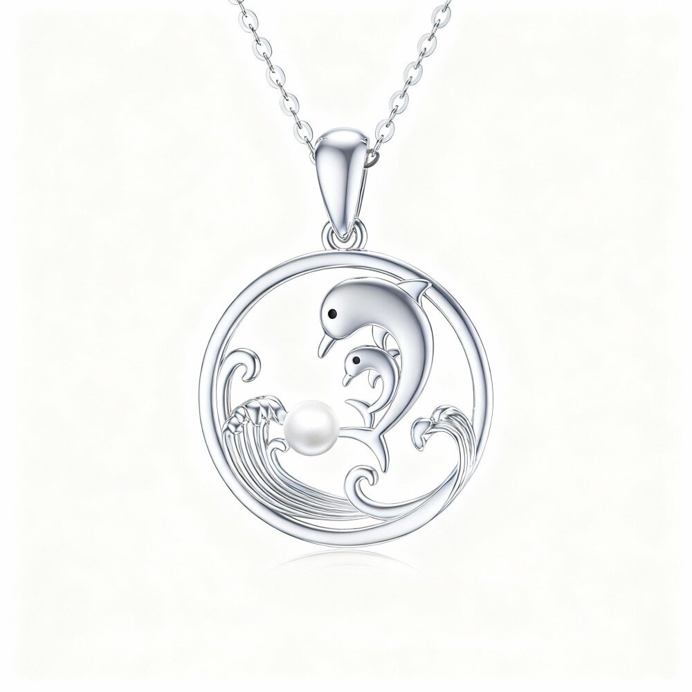 Scopri un'eleganza senza pari con la nostra collana con pendente in Oro Bianco 10K che presenta un affascinante motivo circolare con perla e delfino.
