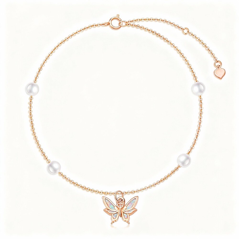 Scopri il fascino del nostro squisito braccialetto caviglia in Oro Rosa 18K a singolo strato con accenti di opale, perla e farfalla, pensato per la donna moderna.