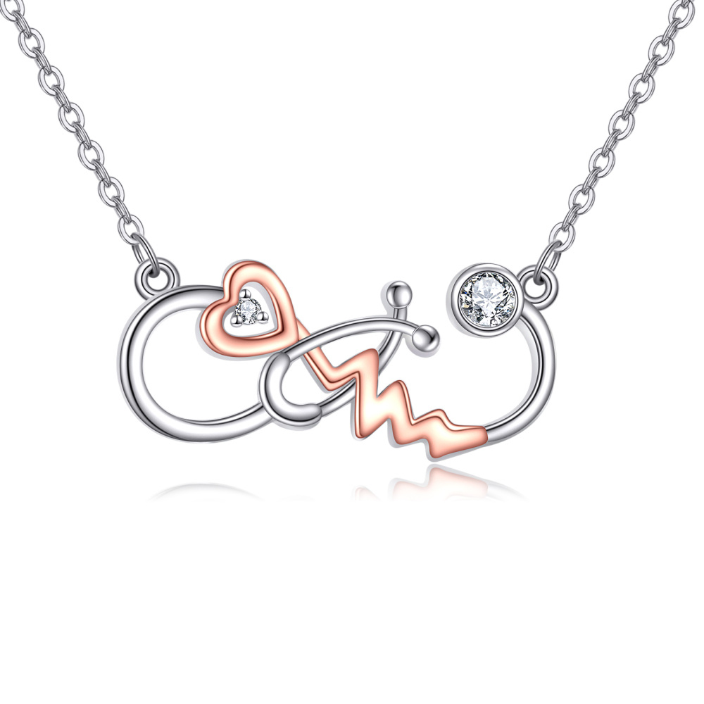 La collana presenta un cuore splendidamente lavorato che si intreccia con un elegante design a forma di stetoscopio, celebrando la dedizione e la passione dei professionisti sanitari. L'impeccabile finitura in argento e oro rosa aggiunge un tocco di raffinatezza, mentre le scintillanti pietre di zirconia cubica donano un tocco di brillantezza accattivante. Regolabile in lunghezza, questa collana con pendente garantisce una vestibilità comoda per tutti, rendendola un accessorio versatile che si abbina perfettamente a qualsiasi outfit, ideale sia per contesti casual che formali.